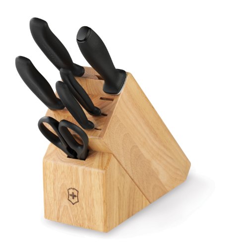 Designed to outfit the kitchen with basic and specialty cutlery, the 7-piece Swiss Classic set from Victorinox provides established and aspiring chefs with top-of-the-line tools. Knives in the set are the following: 3.25" straight and serrated parers (1 each), 4.5" serrated utility, and an 8-inch chef's knife. For keeping blades in prim